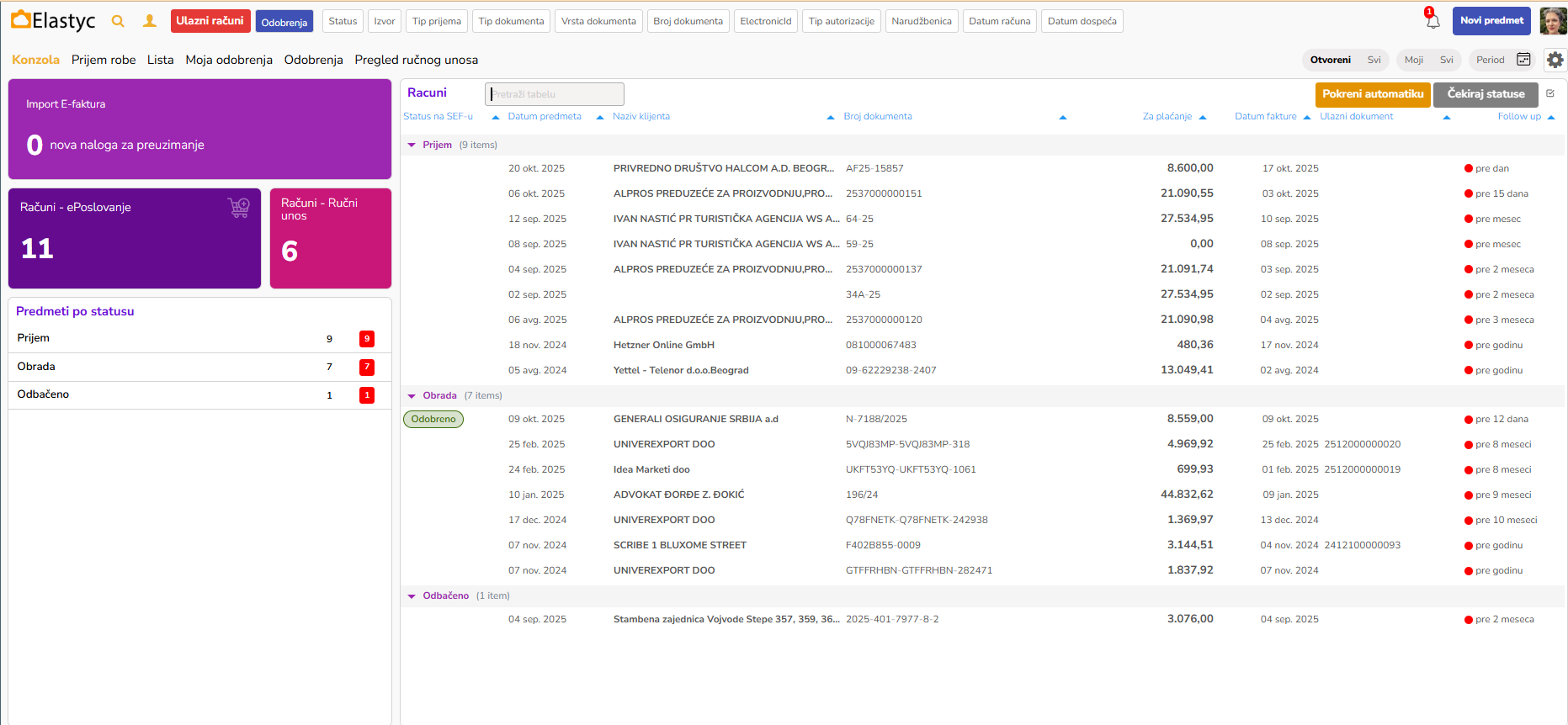 Centralni deo ekrana prikazuje listu svih ulaznih računa podeljenih po statusima: