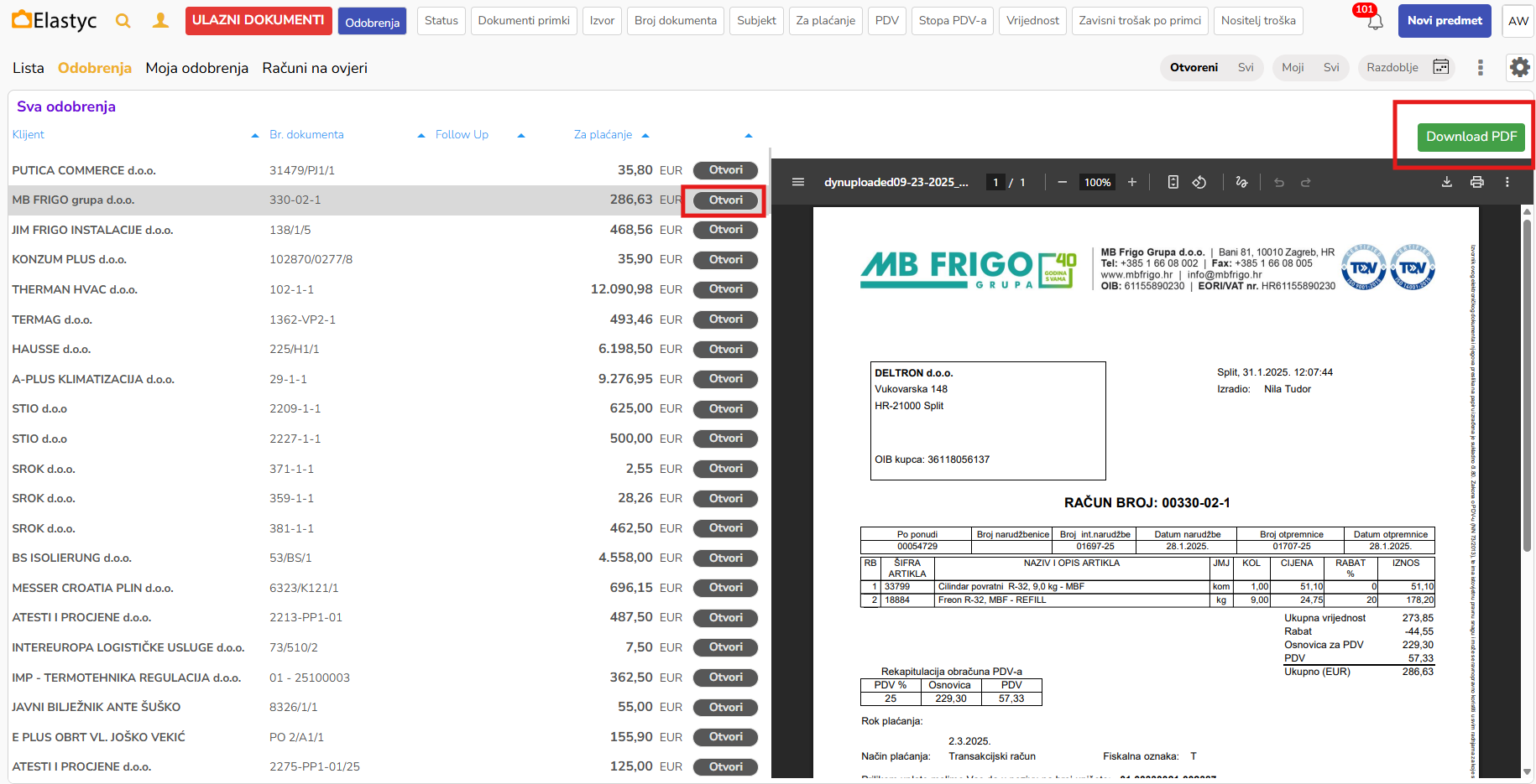 Ovde će biti prikazane prazne tabele ako trenutno nijedan račun nije na odobrenju, svi su odobreni ili klijent ne koristi odobrenja. Ako se ova opcija koristi, ispod je prikaz podataka. Klikom na Download PDF dokument se preuzima direktno na računar, a klikom na Otvori se na svakom pojedinačnom redu u tabeli otvara predmet računa.