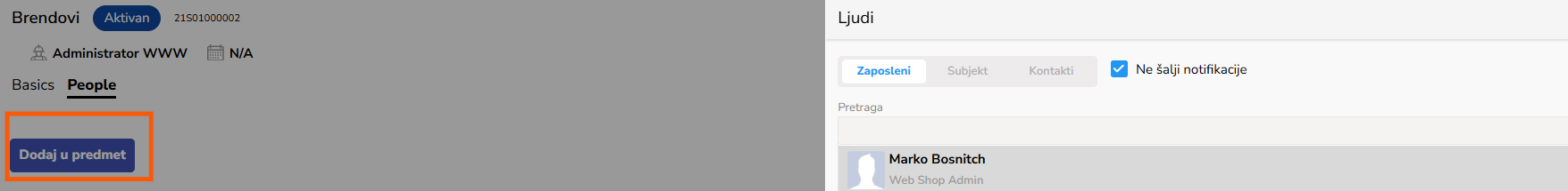 U ovom tabu je lista svih korisnika koji su uključeni u proces rada, počevši od korisnika koji je kreirao predmet Brend. Klikom na dugme Dodaj u predmet otvara se padajući meni za izbor korisnika.