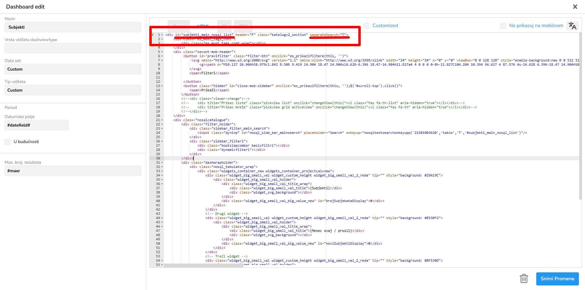 Da bi se ova opcija aktivirala, potrebno je u HTML kodu NoSQL Widget-a u glavnom divu (onaj div gde se nalazi id od widget-a) doda atribut separateSearch="T"!