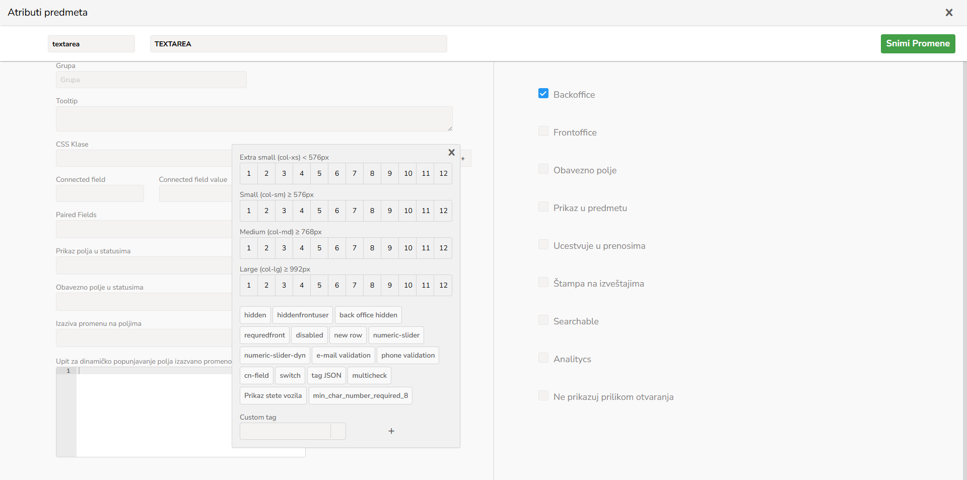 CSS klase na atributu predmeta se koriste kako za definisanje širine i pozicije atributa u predmetu, tako i za definisanje osobina atributa!