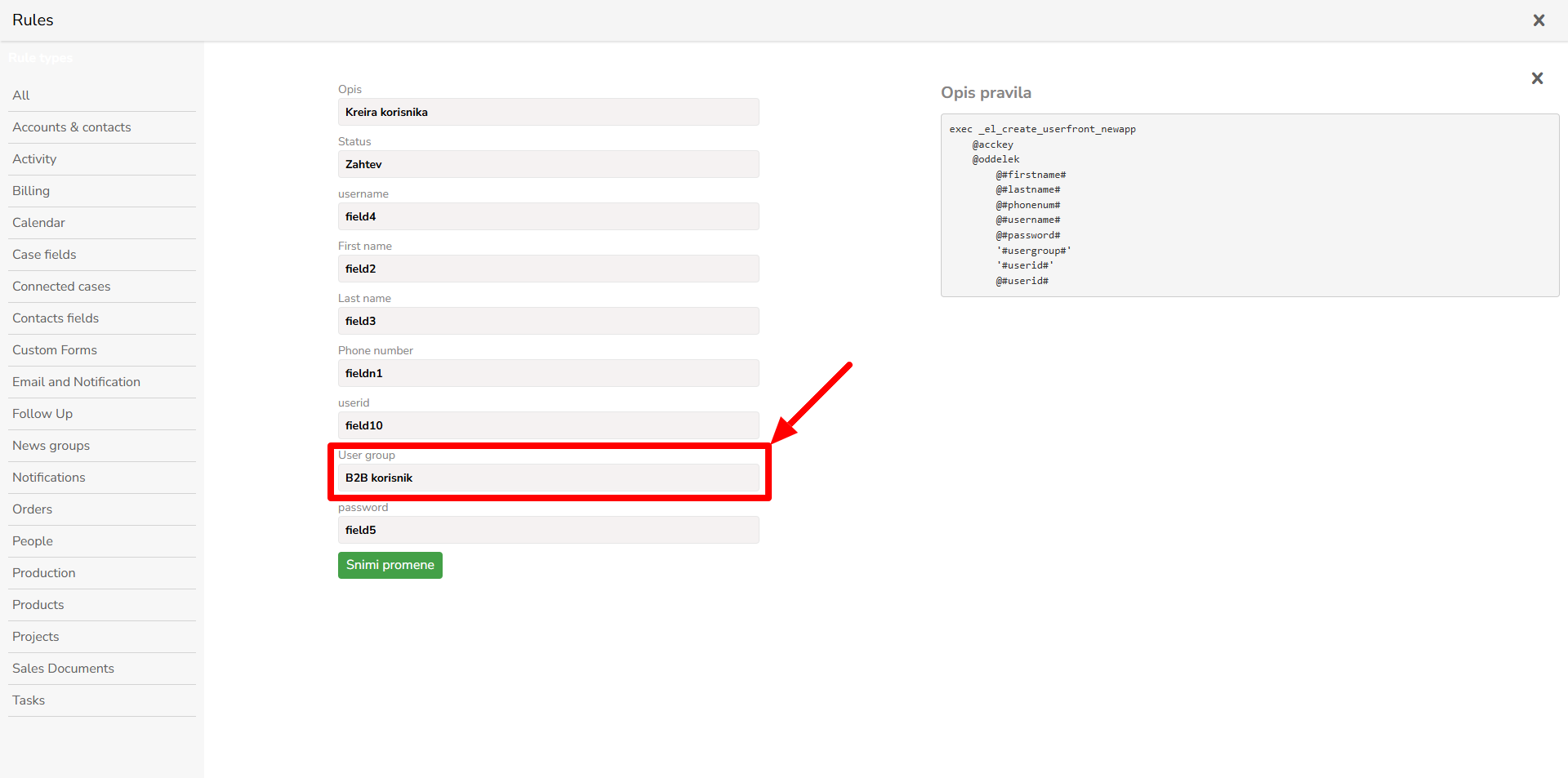 U prozoru "Rules" nalazi se polje "User group" i klikom na to polje otvara se meni sa svim dostupnim korisničkim grupama. Izabrati željenu korisničku grupu. Nakon toga kliknuti na dugme "Snimi promene".