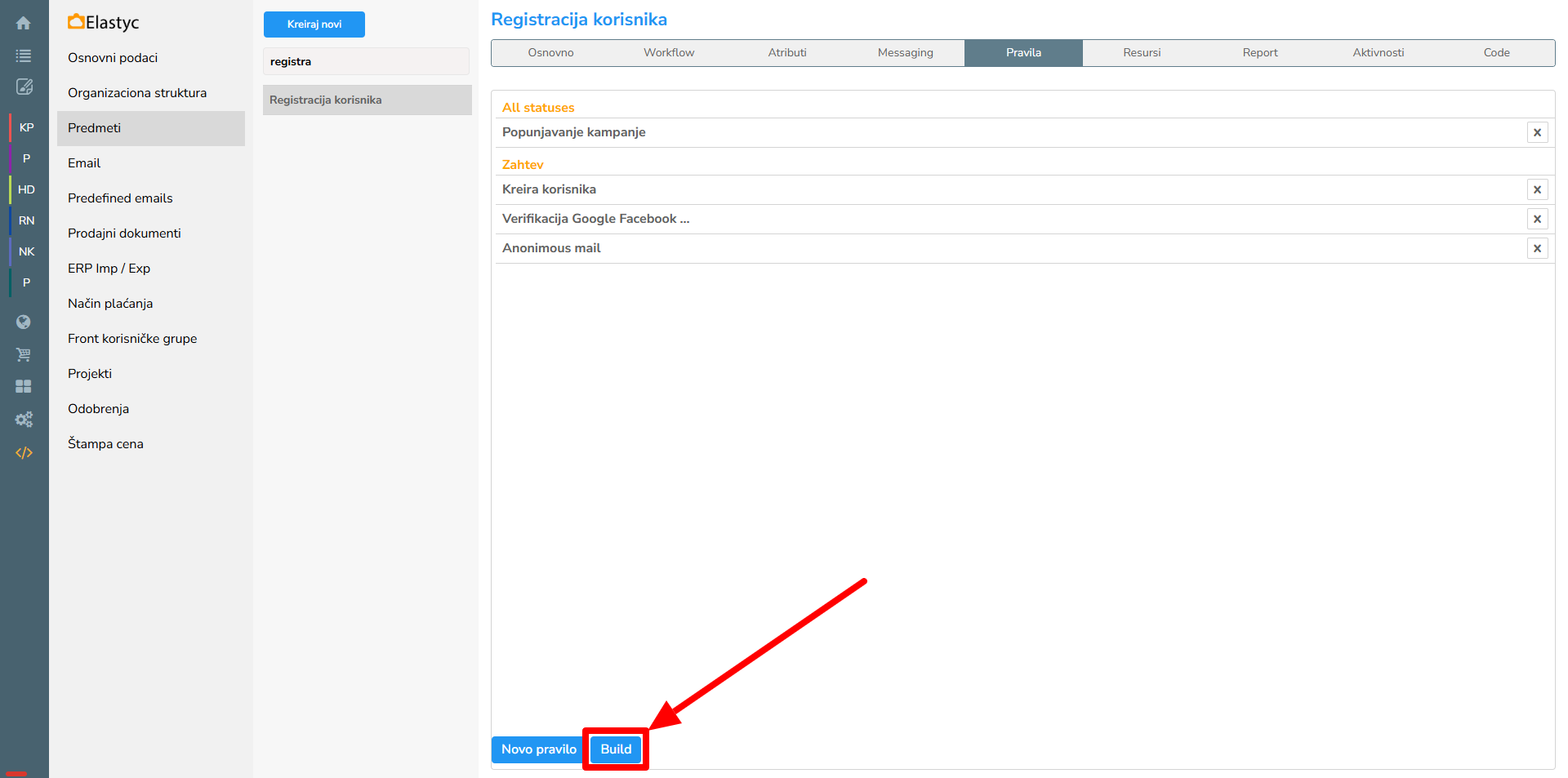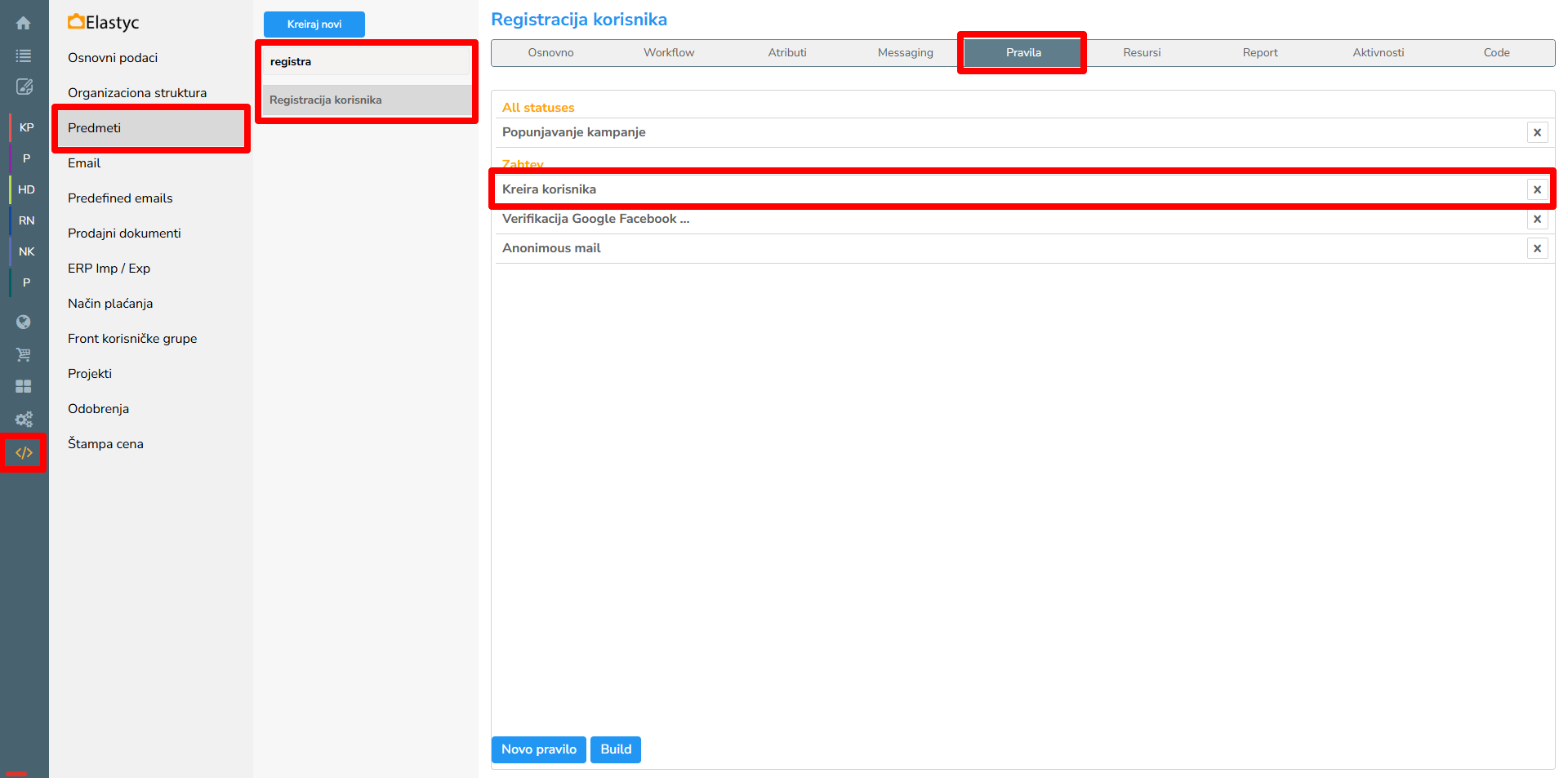 U "Setup" meniju sa leve strane, pod grupom "Predmeti", u listi predmeta pronaći predmet "Registracija korsnika" i na tab "Pravila" otvara se tab "Pravila" sa svim pravilima na prethodno izabranom predmetu. Klikom na pravilo "Kreira korisnika" otvara se prozor sa podešavanjima pravila.