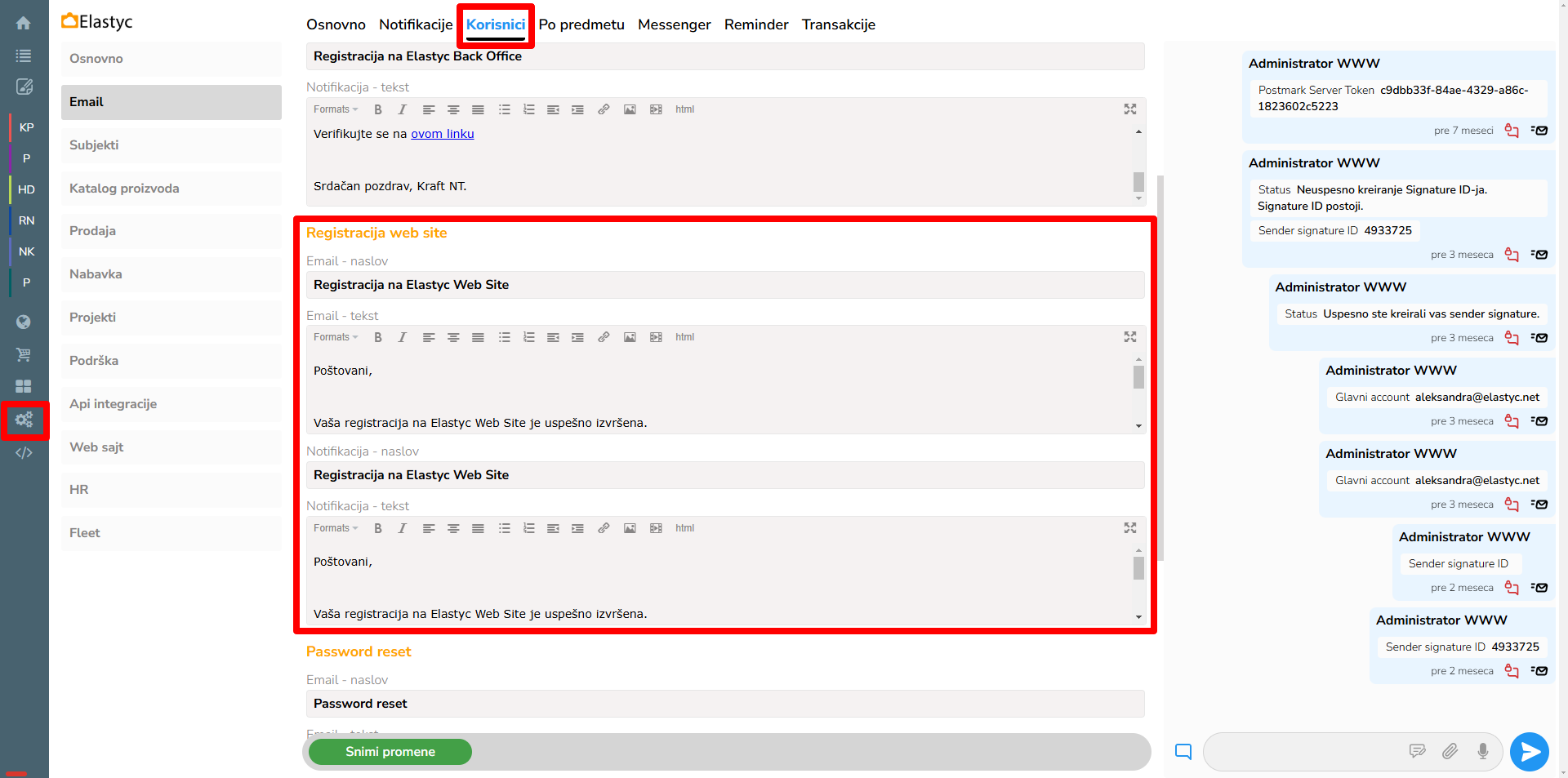 U "Podešavanja" meniju sa leve strane, pod grupom "Email" klikom na tab "Korisnici" otvara se tab "Pravila" sa poljima za definisanje poruka gde se nalaze podešavanja za poruka za registraciju pod grupom "Registracija web site"