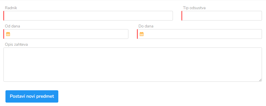 Zaposleni treba da pronađu odgovarajuću sekciju "Zahtev za odsustvo" gde podnosi zahtev.