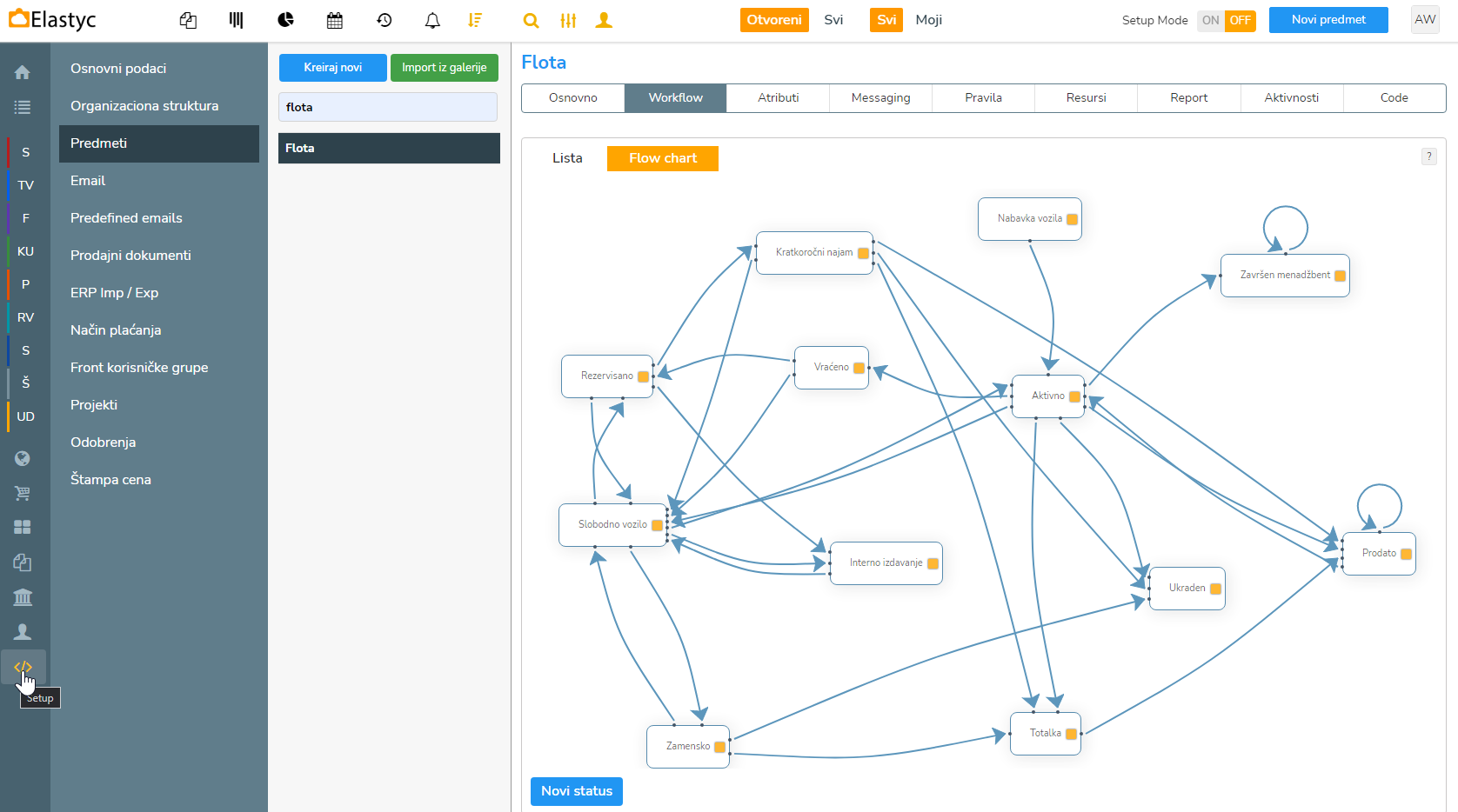 Izborom Setup dugmeta na dnu izbornika osnovnih predmeta na ljevoj strani, ulazimo na izbornik u kojem izabiremo Predmeti, te u tražilici upišemo i izaberemo Flota. Izabiremo Workflow tab, te u Listi imamo popis statusa predmeta u Floti, te prikaz u formi Flow chart-a gdje možemo vidjeti da Aktivno vozilo možemo dobiti preko unesenog Slobodnog vozila iz Templejta Vozila ili direktno iz Nabavke vozila. Pokazat ćemo oba primera.