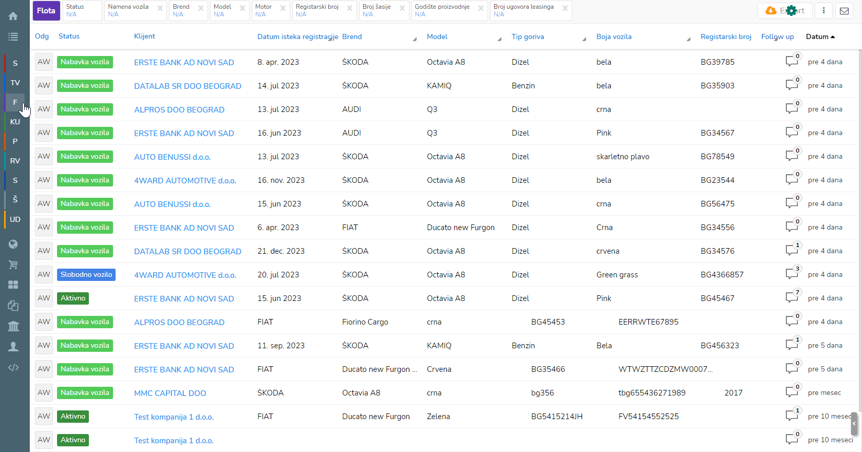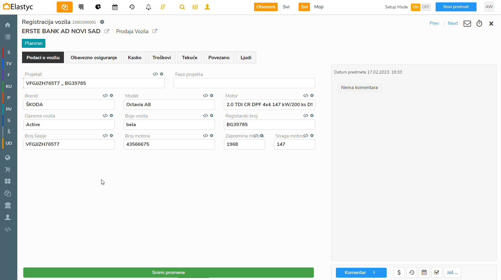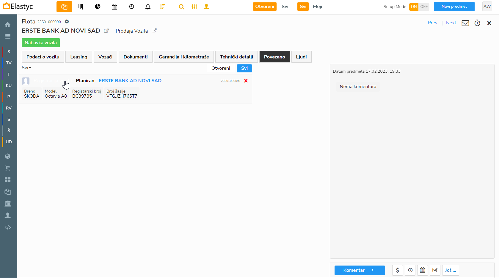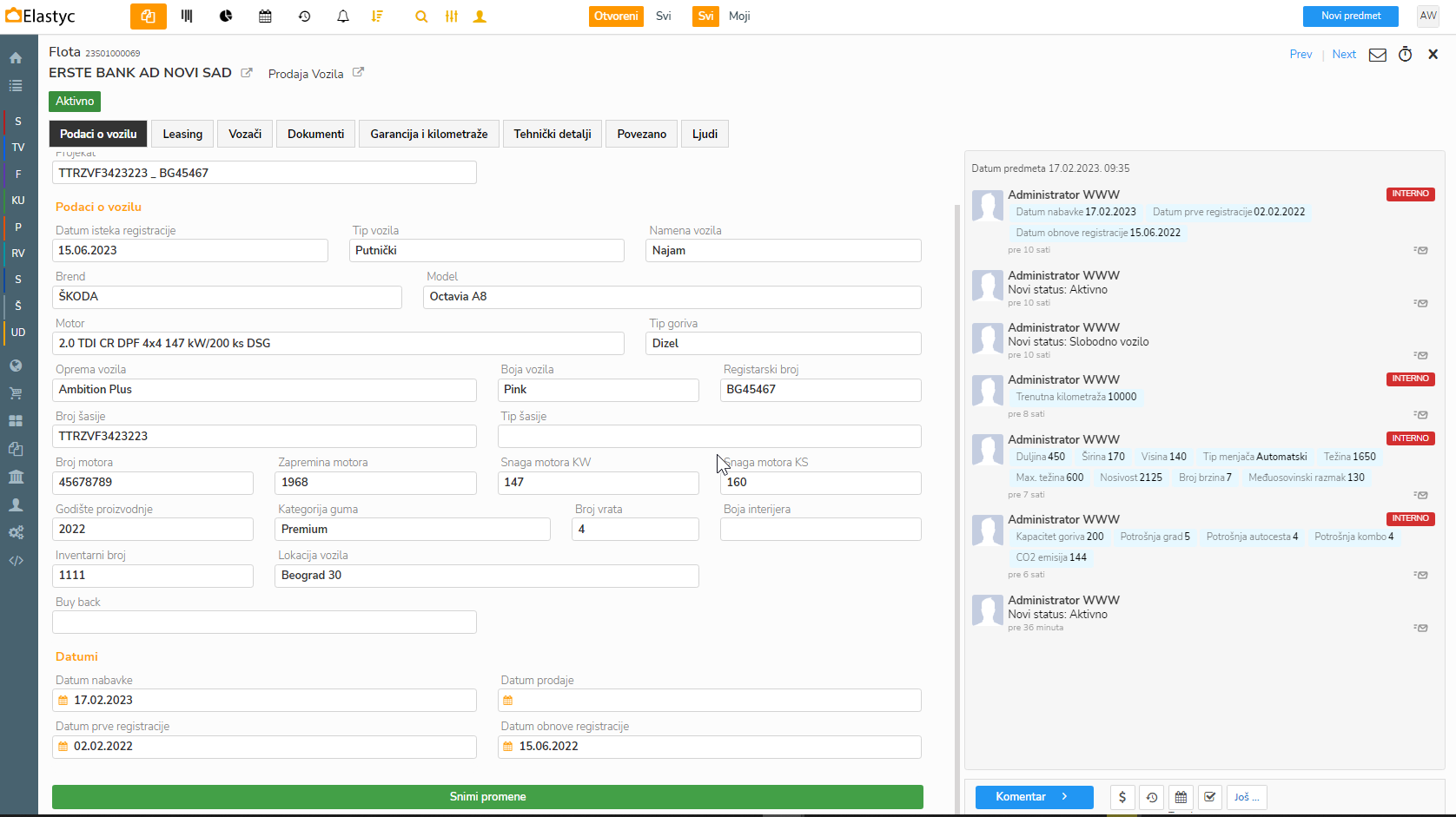 Također tu nalazimo i neke relevantne finansijske podatke kao što su detalji leasinga, preostala vrednost, cena vozila itd koji se dalje prenose u sljedeće predmete kao što su Klijentski ugovori i Ponude..