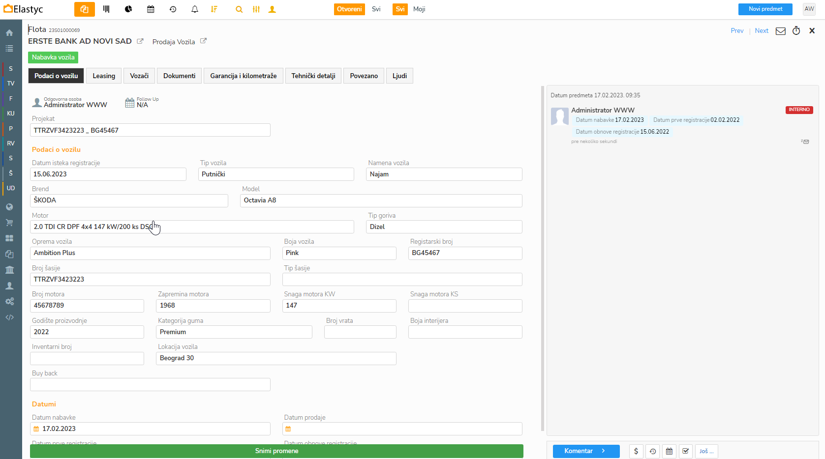 .Sada imamo otvoreni novi Predmet Vozila otvoren u Floti, te ispunimo preostale, većinom tehničke podatke jer vozilo je još uvjek slobodno i nemamo finansijskih i ostalih podataka. Ispunite i ostala relevantna polja....