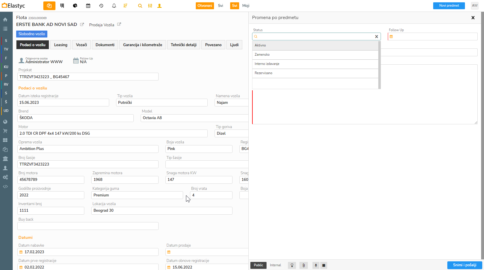 U ovom slučaju vozilo smo prebacili u status Aktivno, te ispunili preostale podatke.