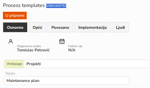 Iz kartice onBoarding, zatim odabirom opcije Process templates, vidimo listu svih procesa. Odabirom jednog od procesa, kopiramo njegovu jedinstvenu šifru, i na taj način se realizuje import iz galerije.