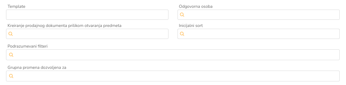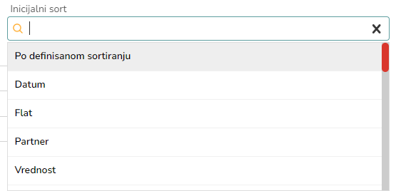Inicijalni sort definiše koji će biti početni poredak predmeta na aplikaciji. Postoje ponudjene opcije, kao što su sortiranje po datumu, partneru, korisniku i td.