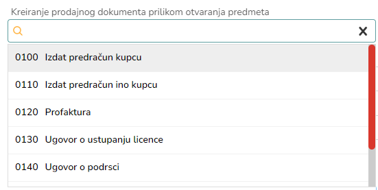 Ukoliko želimo da se prilikom otvaranja predmeta kreira prodajni dokument, izaberemo ga iz padajuće liste. U zavisnosti od izabranog dokumenta, popunjavaju se odredjeni podaci.