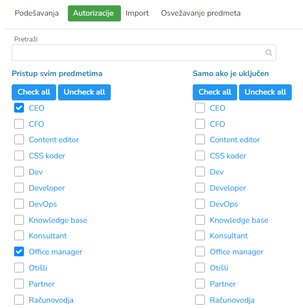 Prikaz autorizacija po ovom predmetu vrši se na segmentu Radna mesta. Označavaju se različita zaduženja za svako radno mesto posebno.