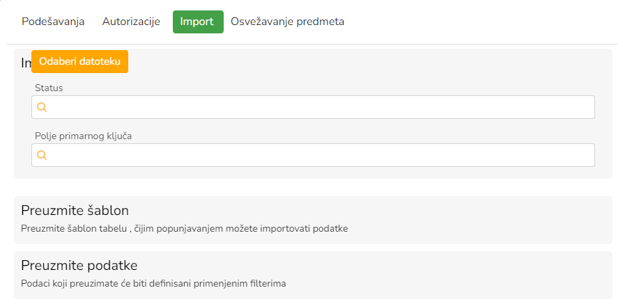 Importovanje podataka po predmetu na osnovu definisanih šablona.