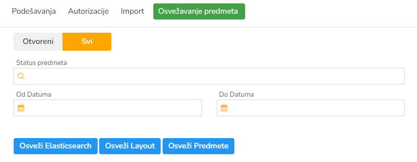 Pritiskom na dugme Osveži Predmete pokreće proceduru koja izvršava pravila po tom predmetu. Najčešće se koristi u slučajevima kada odradimo izmenu nekih pravila na predmetu, pa želimo to pravilo da primenimo i na predmete koji su ranije kreirani (po starom pravilu).