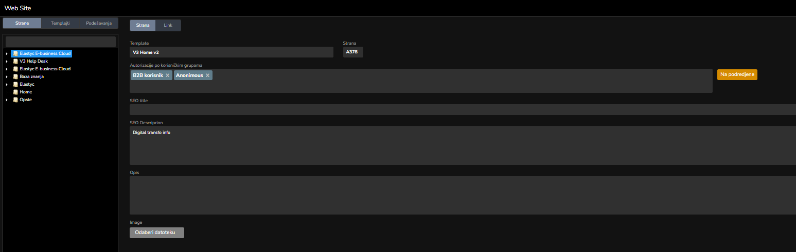 Template - polje gde se prikazuje koji front template se primenjuje na odabranoj stranici. Klikom na polje se otvara padajuća lista sa svim templejtima. Prilikom promene neophodno je kliknuti na dugme "Snimi promene" u donjem desnom uglu.