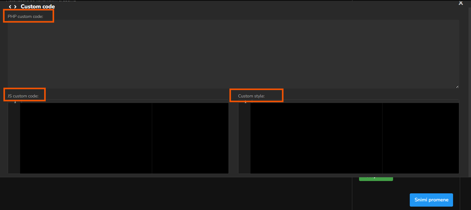 Custom code dugme otvara dodatni prozor koji sadrži tri polja za unos custom koda: