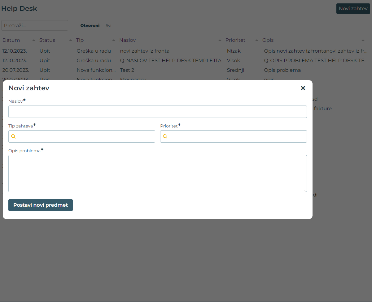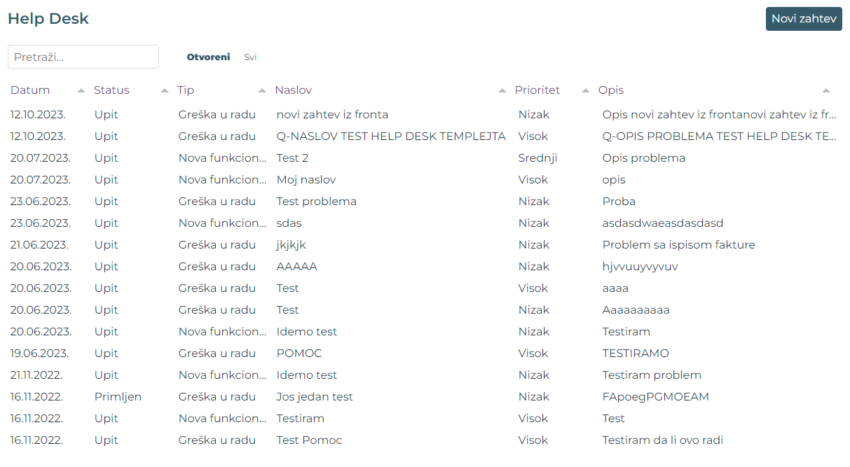 Na pocetnoj strani imamo tabelu klijentskih zahteva (problema).