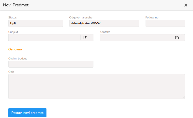 Prilikom kreiranja nove stavke formulara, potrebno je uneti sledeće podatke: