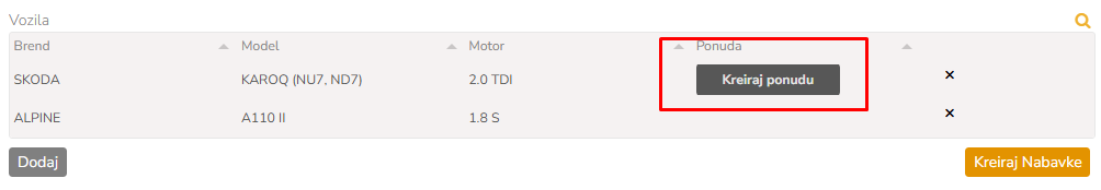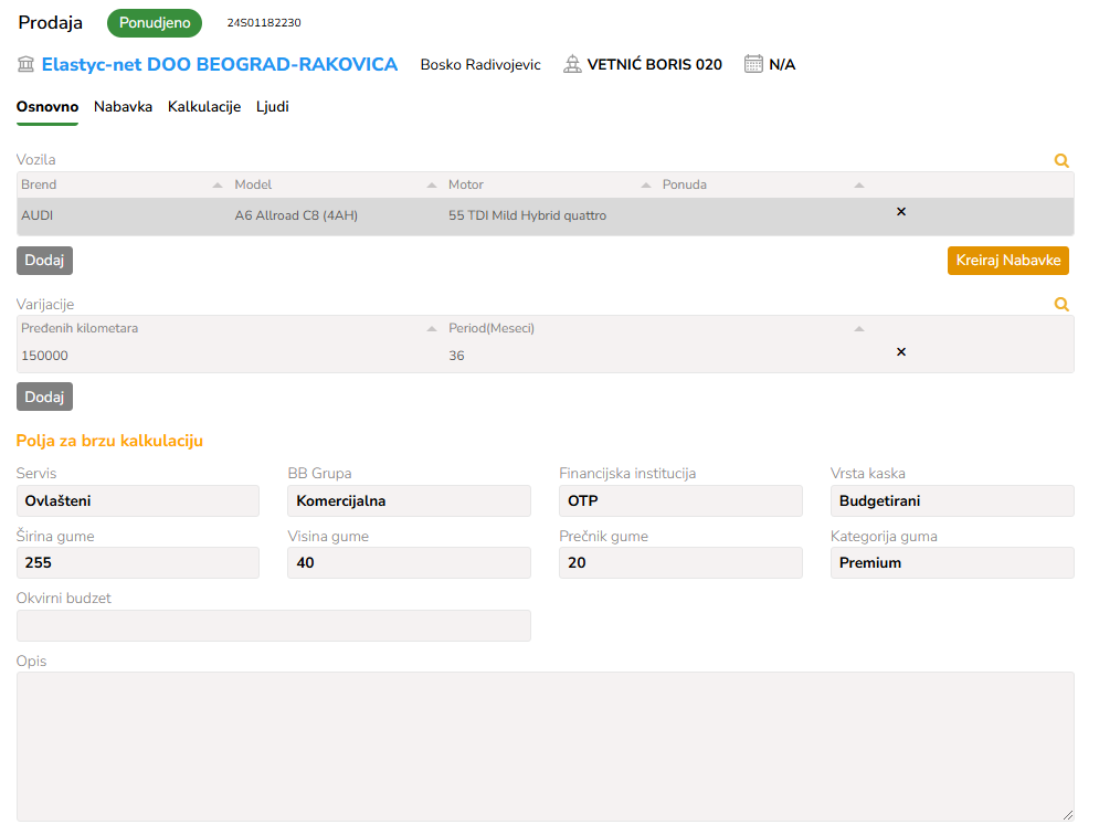 Pretražite željenu vrstu varijacije ako je uneta. U suprotnom stisnite dodaj, i unesite sve detalje vozila koja će se dalje koristiti za kreiranje Nabavke, a zatim i Ponude.