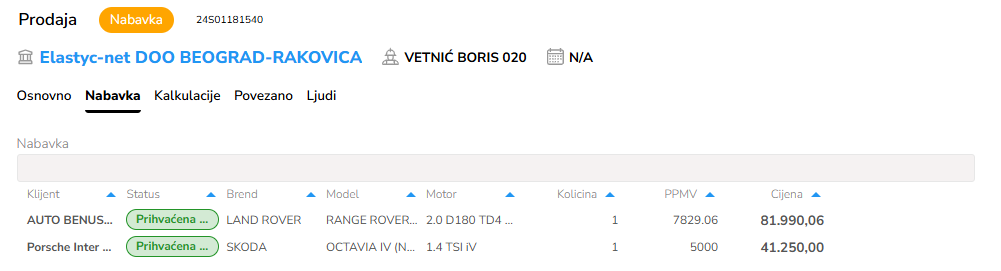Pretražite željenu vrstu vozila ako je uneta. U suprotnom stisnite dodaj, i unesite sve detalje vozila koja će se dalje koristiti za kreiranje Nabavke, a zatim i Ponude. Sve vreddnosti koje će biti unete u dalje navedenom formularu će se preneti na premdete Nabavke i Ponude, oji će biti kreirani iz dotične Prodaje.