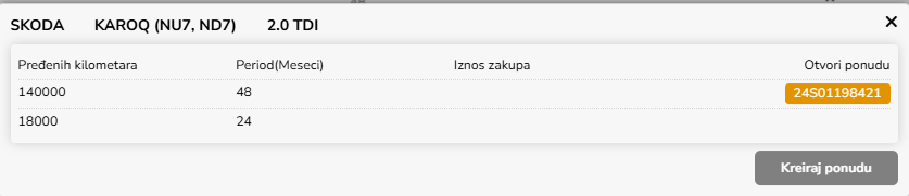 Pređenih kilometara - broj planiranih pređenih kilometra za period trajanja najma.