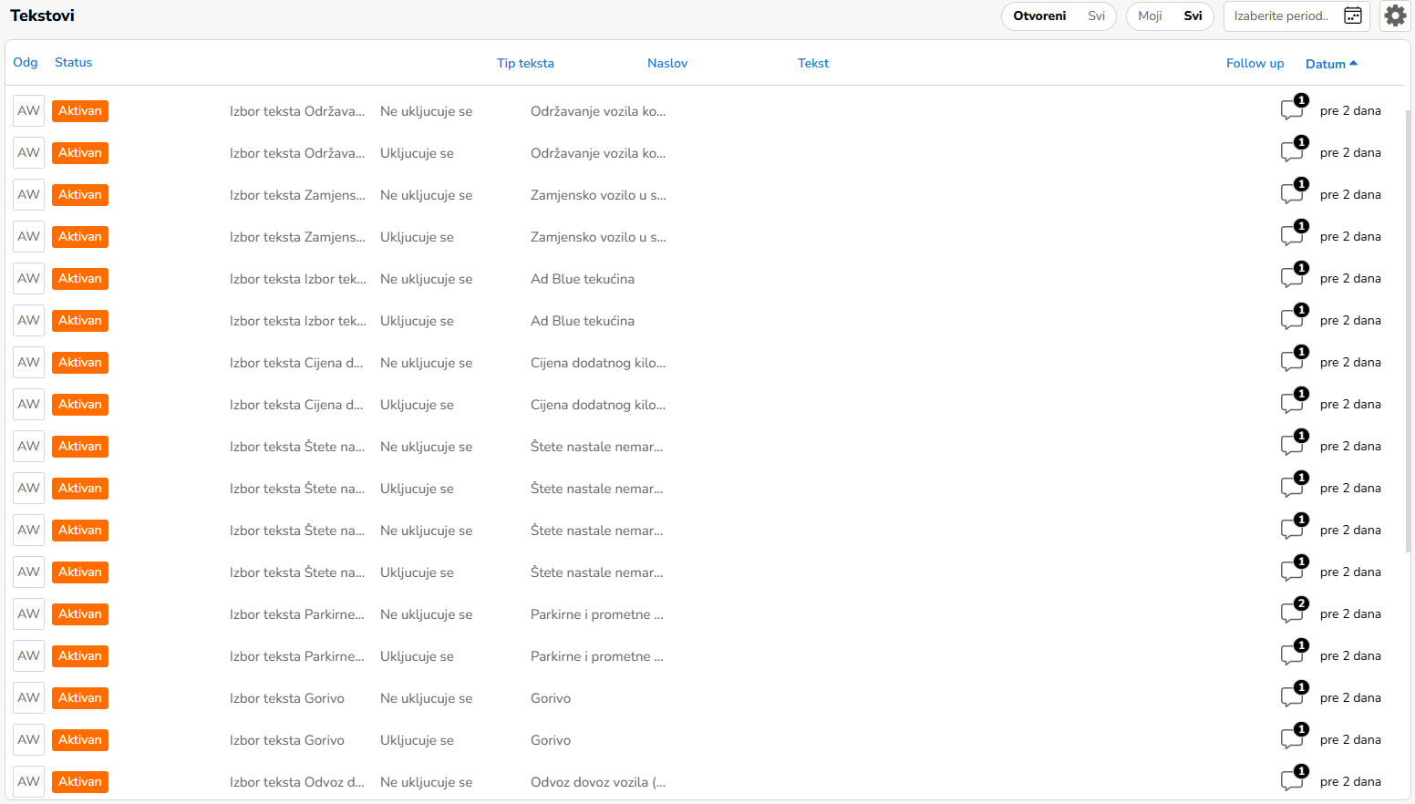 Nakon odabira predmeta Tekstovi za ponudu iz liste predmeta, otvara se lista svih kreiranih Tekstovi za ponudu.