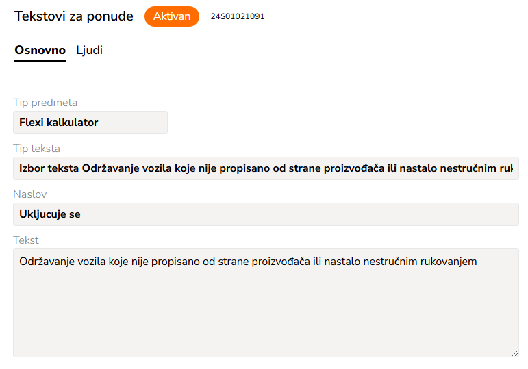 Tekstovi za ponudu odnose se definisanje tekstova koji će se prikazivati na dokumentima ponude na predmetima, kao na primer - Flexi kalkulator. Ovi tekstovi mogu se odnositi na više različitih ispisa tekstova na ponudi, kao što su tekstovi za usluge koje su uključene ili nisu uključene u cenu, načini plaćanja, garancije i ostali predefinisani tekstovi za PDF ponudu