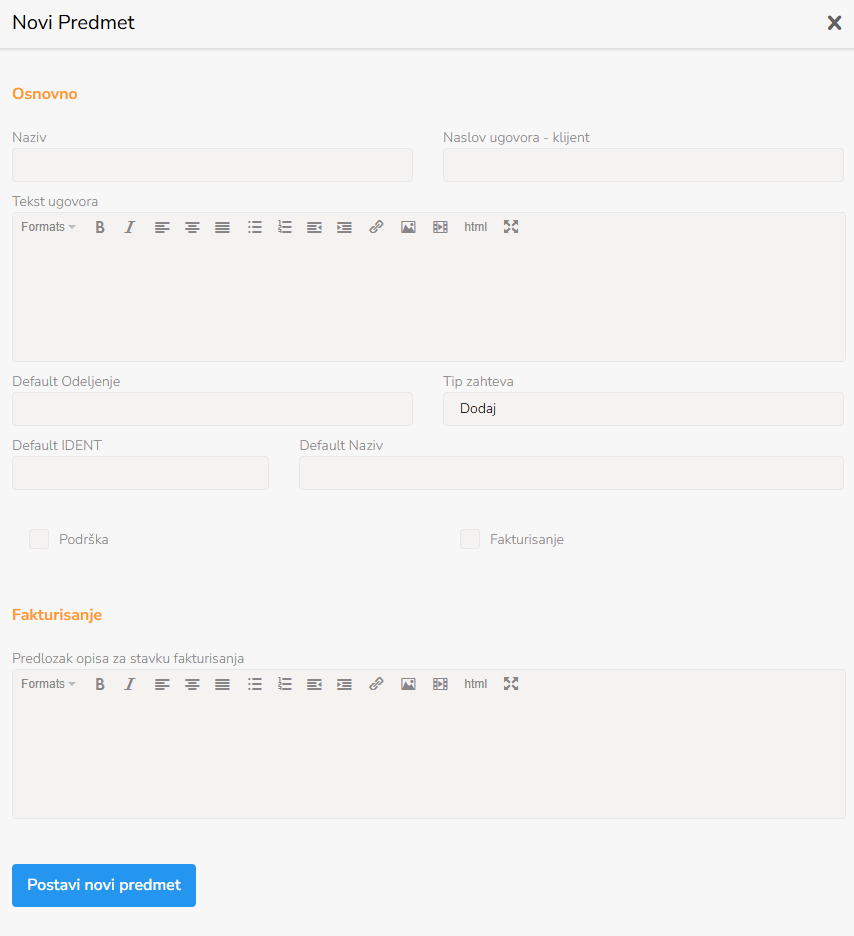 Označite da li se za dotični tip ugovora koristi Podrška. Ukoliko checkbox Podrška nije označen, tab Podrška na predmetu SLA neće biti prikazan.