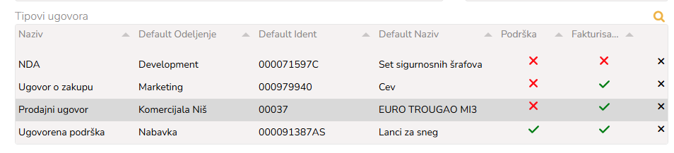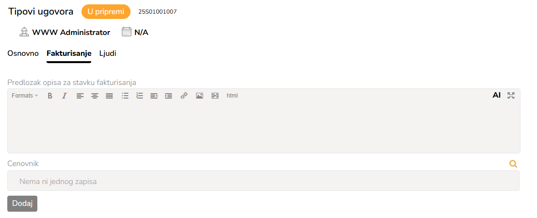 Označite da li se za dotični tip ugovora koristi Fakturisanje. Ukoliko checkbox Fakturisanje nije označen, tab Fakturisanje na predmetu SLA neće biti prikazan.