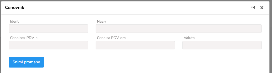 Ident - Izaberite ident za konkretnu vrstu cenovnika. Na osnovu izabranog identa, automatski će se popuniti sva ostala polja na ovoj formi. Izbornik identa vizuelno prikazuje sve vrednosti koje će biti popunjene: naziv, cenu bez PDV-a, cenu sa PDV-om i valutu.