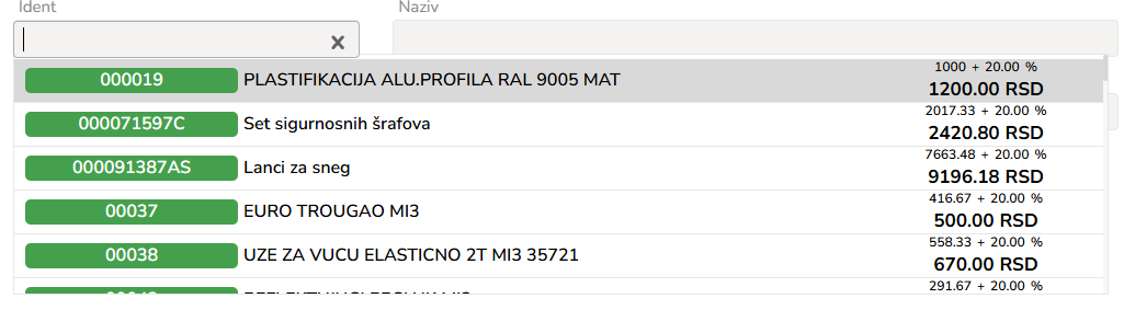 Cena bez PDV-a - Prilikom izbora Identa, automatski će biti popunjena cena bez PDV-a.